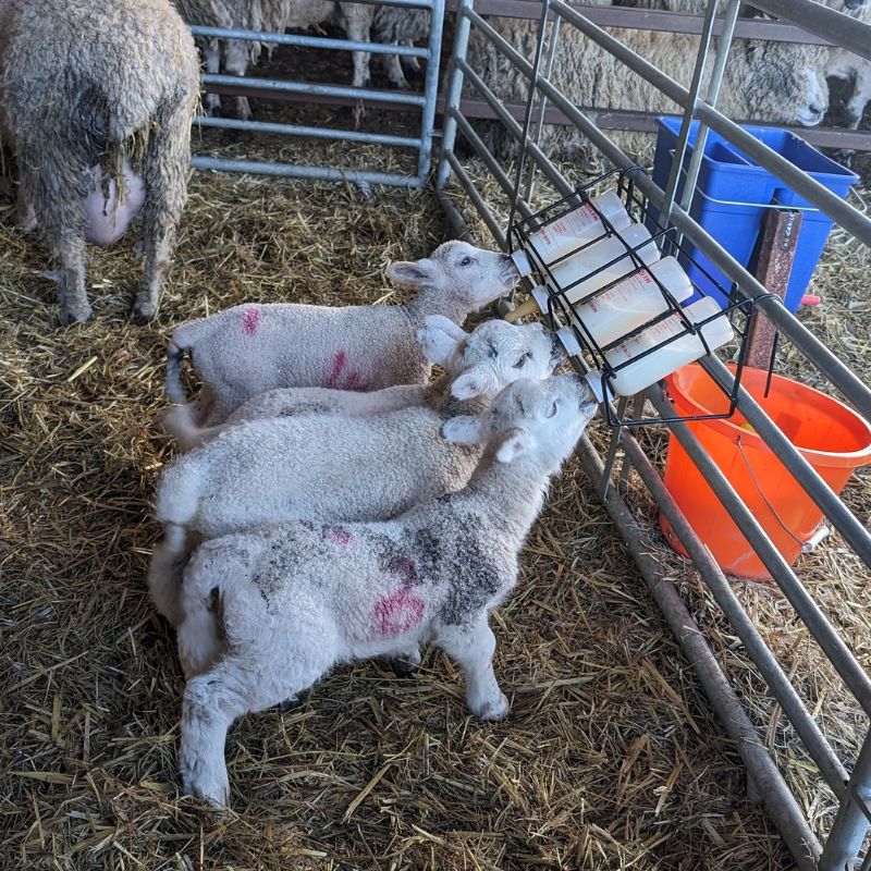 We lamb each years with the new arrivals being born to coincide with the Easter school holidays and we often have some lambs to bottle feed. Here we see four lambs feeding simultaneously, leaving staff free to check on the other expectant mums and lambs.