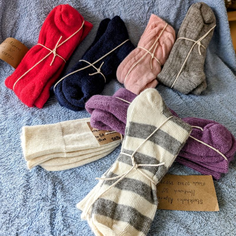 We have a small range of alpaca-themed items for sale in the Tearoom, including fibre socks, gloves, t-shirts, pictures, birthday cards, cuddly toys and keyrings.